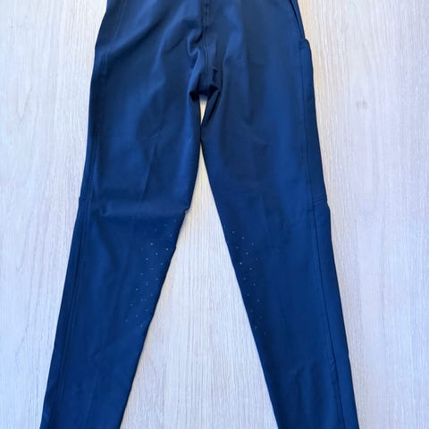 Svart ridebukse i tykk bomull med forsterkning på innsiden av leggene.