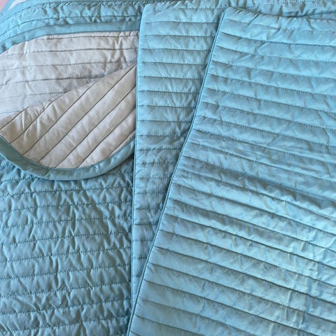 2 stk dynetrekk i krepp. Lys turkis/mintgrønn. Mangler et par bånd og det ene dynetrekket er skjøtet på tvers. Mer slitt enn andre dynetrekk i andre annonser. Selges derfor samlet for kr. 140,- + frakt.