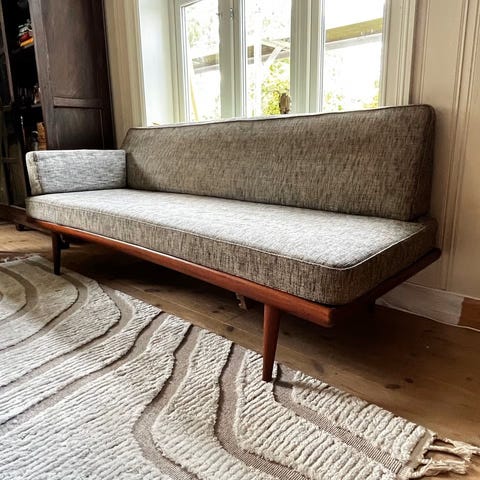 Pent brukt daybed i teak til salgs. Den ble trukket om i nytt stoff i 2023. Enkelte bruksmerker på treverket. Puter på bildene følger med.
