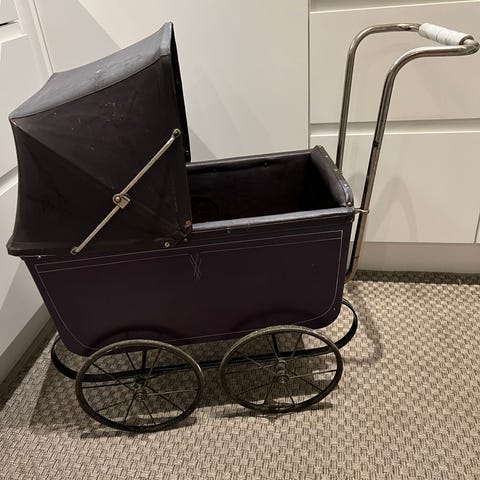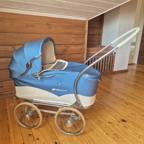 Gammal svithun barnevogn selges, patina finnes da den har blitt brukt av flere generasjoner. Husker ikke modell. Har byttet lærbeltene til dempinga. Veldig god å trille, barnet lå godt oppi. Er original bortsett fra sideveggen innvendig og madrassen. Pris kan diskuteres ved hurtig avgjørelse