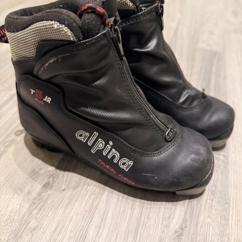 Alpina skisko i svart farge med røde lisser. Skiene har en solid konstruksjon med feste for bindinger under sålen. Egnet for bruk med langrennsski.
