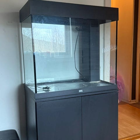 Juwel Aquarium med lokk, integrert belysning og filter. Passer for akvariefisk og vannplanter. Inkluderer pumpe og termometer. Svart ramme og lokk, med klart glass. Egnet for hjemmebruk og akvariehobby. 100l