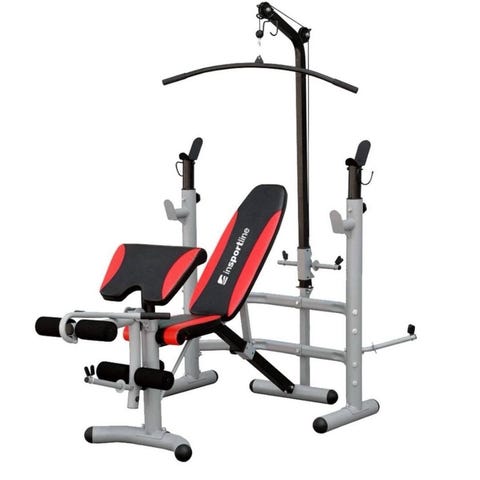 Powerline treningsbenk. Benken har polstret ryggstøtte og sete, samt støtte for benøvelser. Egnet for styrketrening med frivekter.
