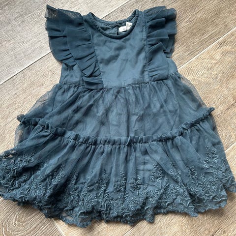 Newbie kjole for jente i størrelse 86. Kjolen kommer i to varianter: en i vinrød med kort erme og blonder, og en i beige med lange ermer og lommer. Materialet har tekstur og detaljer som gir et dekorativt utseende.