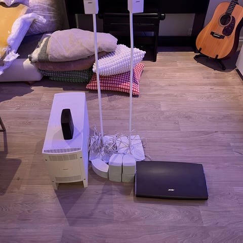 I daglig bruk inntil nylig. Front og bak høyttalere. 2 x veggfester og diverse kabler. Fjernkontroll.