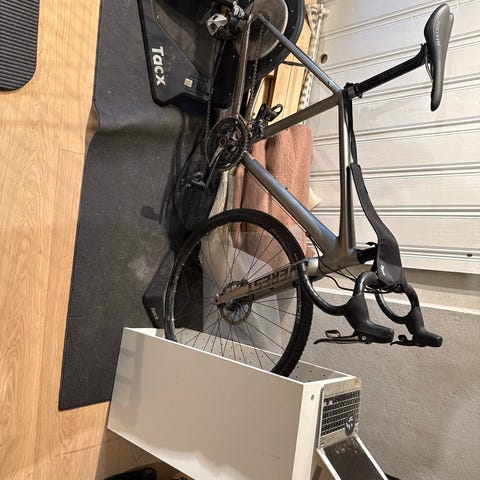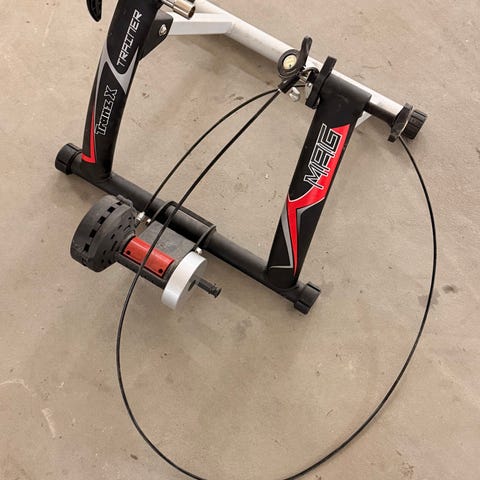 Tacx Antares sykkelrulle for innendørs trening. Produktet har en blå treningsflate og tre støttehjul for stabilitet. Egnet for bruk med ulike sykkelmodeller for trening og oppvarming innendørs.