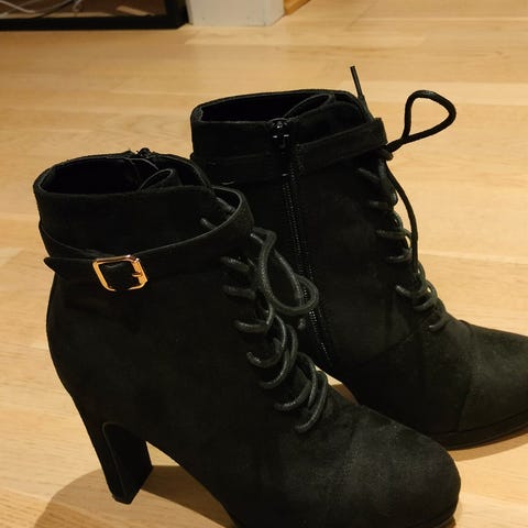 Svarte sko i str 37. Skoene har åpen tå og ankelrem med spenne. Aldri brukt