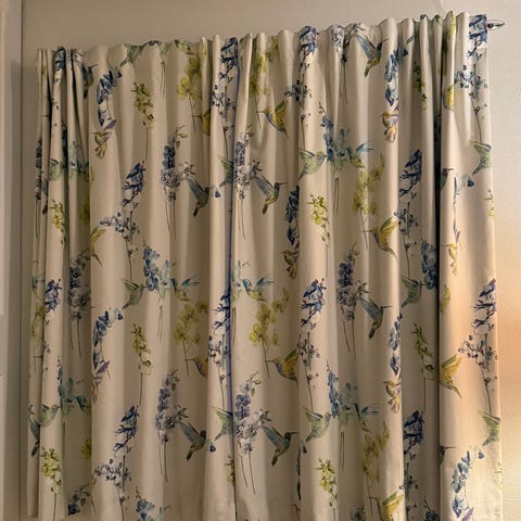 Selger pene mørkleggingsgardiner med maljer i blå/grå blomsterprint. Gardinene skjermer godt for lys og faller fint, perfekt til soverom.