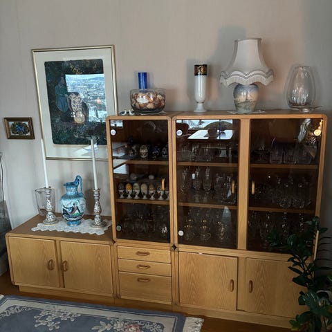 Skjenk i tre med skuffer og skap