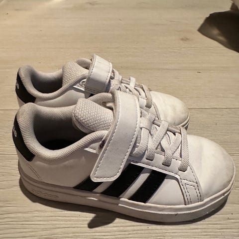 Adidas sneakers i str 32. Ingen slitasje, men litt mørkere i sømmene. Mulig det kan vaskes bort.