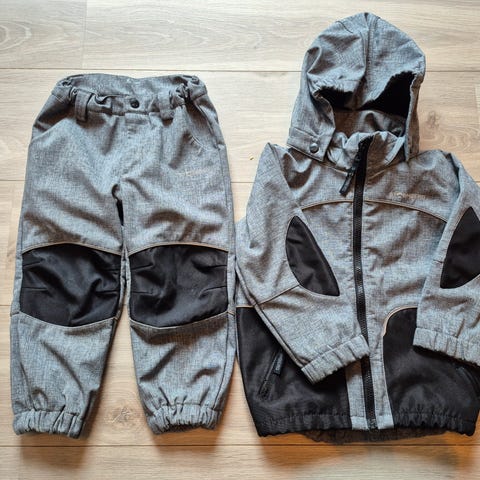 Stormberg bukse og jakke i størrelse 98, unisex, laget av polyester. Svarte forsterkninger på knær og albuer. Jakken har hette og glidelås, mens buksen har elastiske mansjetter og justerbar midje. Fleecefor.