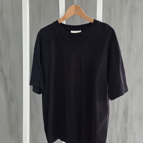 Marineblå og hvit tykk t-skjorte. Helt ny da mannen ikke likte den. Aldri brukt. Materialet er tykt til å være en topp. 59 % polyester, 40 % bomull, 1 % elastan. Kantene er 100 % bomull. Toppen er myk og komfortabel.