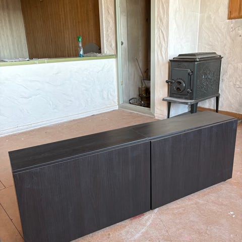 Det er noen skruehull mellom skapene for at de skal være festet sammen når de henger på veggen. Ikke synlig så lenge de henger sammen. Det er også et større hull på den ene siden av det ene skapet for å få ut ledninger til TV. Dette kan fint skjules ved å plassere den siden inn mot en vegg. Det er noen bruksmerker på toppen av skapene, se bilde.
