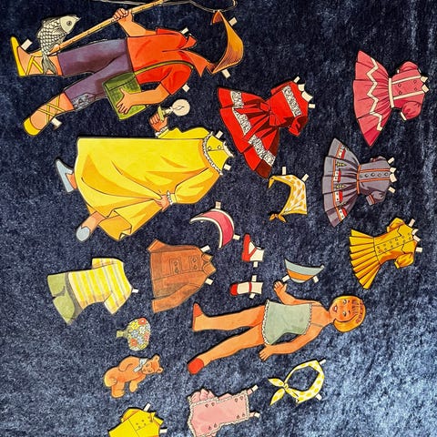 Antikke papirdukker, gjenopptrykking av C. Delattre i Stockholm. Papirdukkene er trykket på solid papp, og måler 53x38 cm. Selges for 75.- pr stk.+ porto.