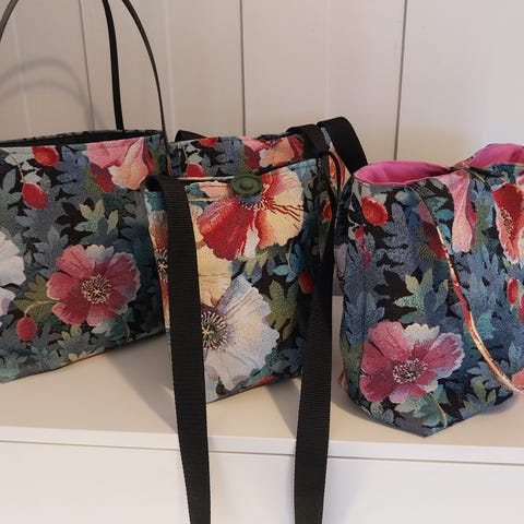Totebag Store m/ skulder mulighet. Grå med sorte/blå /hvite striper. Grått for. Høyde.32..bredde,,35..dybde.8..Pris:500.- Porto i tillegg ved sending