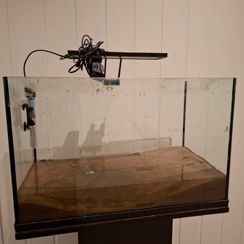 Akvarium med filter og dekorasjon