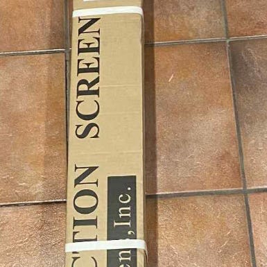 Elite screens manuelt lerret i god stand. Hengt i et lyskontrollert rom uten direkte sollys. Litt over 280 cm bred.