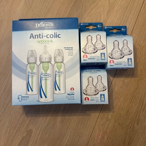 Selger ubrukt Dr Browns babyflasker. En er testet på baby, to er helt ubrukte. Tutstørrelse er av Level 1 (0mnd+)