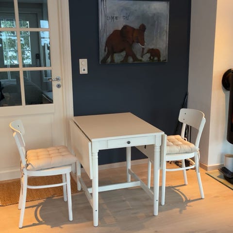Ungdommen skal ha seg nytt større kjøkkenbord da må dem selge sitt solide gamle bord med to stoler. hentes på Jar etter avtale. 500kr fastpris så at dem får tilskudd til nytt bord 😃