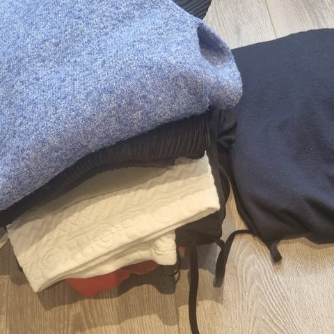 Tufte blå longs 50% ull og 40% bambus rayon, Neomondo svart topp 70% merinoull. De er merket med str s men tilsvarer xs. Begge er pent brukte uten hull eller flekker. Selges samlet kr 100,-.