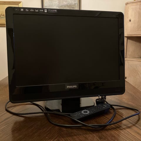 Sharp TV med svart farge. TV-en har flere tilkoblingsmuligheter på baksiden, inkludert AV-innganger og antenneinngang. Den har manuelle kontrollknapper på siden for enkel betjening.
