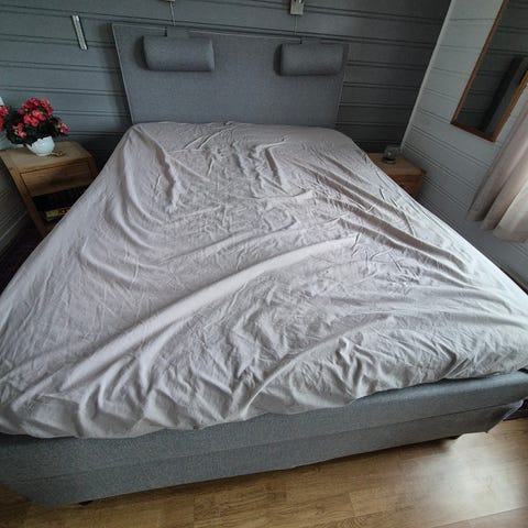 Dobbeltseng med overmadrass. Noen flekker. Må hentes.