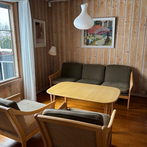 Har også en 3 seter samme type med dunputer - men der er looscover er trekket slitt - kan syes nytt eller lappes der det er slitt.