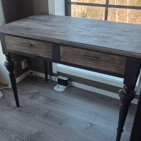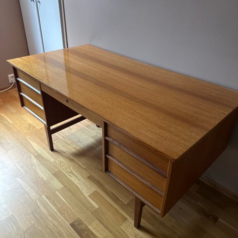 Stort solid skrivebord av eldre årgang selges. Må hentes i Svolvær. Dype skuffer og skap.