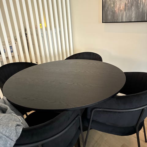 Spisegruppe med 1 bord og 4 stoler. Bordet har pulverlakkerte metallben og en bordplate i foliert MDF. Det er et lite hakk i folien (se bilde)
