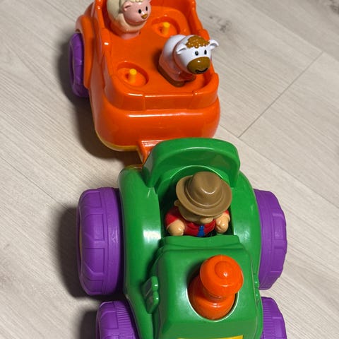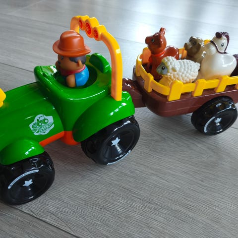 Traktor med blå farge og gul tilhenger. Inkluderer flere dyrefigurer i plast, blant annet sau, ku, hest og gris. Lager dyrelyder, sang og kan kjøre fremover. Hentes i Nordbyen.