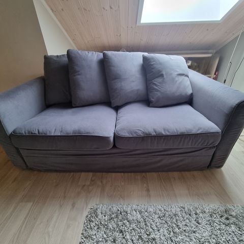 Selger en behagelig sovesofa kjøpt på IKEA for 3 år siden. Sofaen er hel og fin uten skader, men den grå fargen er noe solbleket. Den er god å sitte i og enkel å gjøre om til seng. Det følger med 3 ryggputer.