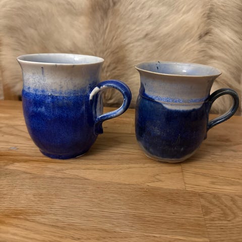 Sett med to keramikk kopper med ulik innvendig farge, en grønn og en blå. Hver kopp har håndmalt design med tekst og er laget av keramikkmateriale.