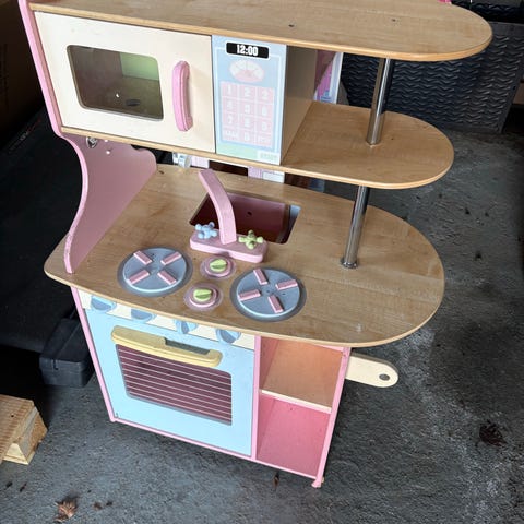 Lekekjøkken i grønn farge med skapdører, skuffer og en vask med kran. Kjøkkenet har en benkeplate i lys trefarge og er utstyrt med elektrisk ledning for tilkobling. Passer til lek og rollelek.