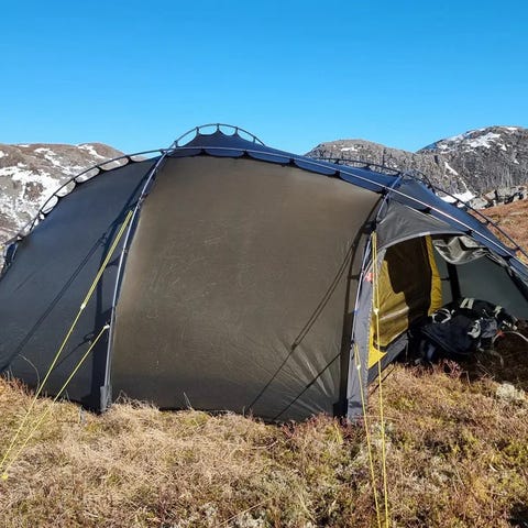 NORTENT Gamme 6 er et svært sterkt og solid telt. Et stort "hjem" for hele 6 personer med 2 innganger. Ved bruk av innertelt 4 personer med plass til bagasje. Gamme 6 er konstruert for de mest ugjestmilde forhold. Romslig, men samtidig mobilt og lett i forhold til hva dette teltet har å tilby. Gamme 6 har hele 5 stenger med syv krysspunkter. I tillegg til at dette teltet er selvstående, gir de fem aluminiumsstengene en enormt sterk konstruksjon som tåler hardt vær og tung snøbelastning. En virkelig "bunkers" å ha med seg i sekken. Ordet Gamme stammer fra en urgammel norsk byggeskikk som ga skjul og trygghet for urfolket gjennom århundrer. Dette har gitt oss inspirasjon til å designe teltet med bakgrunn i nettopp denne eldgamle norske formen for jordhytte. En form for jordhytte som er brukt siden de første menneskene kom til Norge, og brukt av samene fram til i dag. I likhet med alle våre telt, har også Gamme 6 stormmatter rundt hele teltet for om mulig gjøre teltet ennå mer stabil hvor man kan spa snø, eller steiner over disse. Et 4 sesongers telt som gir ly og beskyttelse under de fleste forhold. Sommer som vinter. Selv uten bardunfester står teltet svært støtt i vinf vind. Men dersom behovet skulle melde seg, har teltet hele 8 bardunfester. Et virkelig allsidig 4 mannstelt for de aller fleste eventyr og ekspedisjoner.