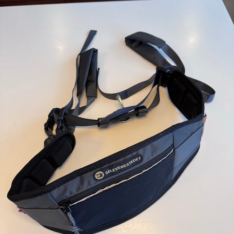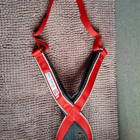 Kjørestrikk (rush joring line) som er 160 cm lang og 6 mm bred kan eventuelt kjøpes med til 450 kroner. Brukt én gang. Ny pris: 679 kroner.