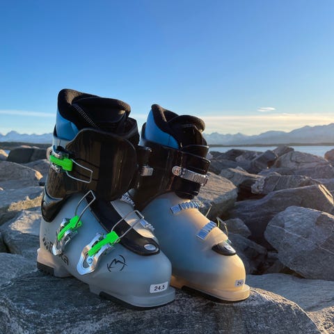 Roxa barn skistøvler med størrelse fra 19,5 til 22,5 cm. Støvlene har hvit og rosa farge og er designet for barn. Se bilde for str