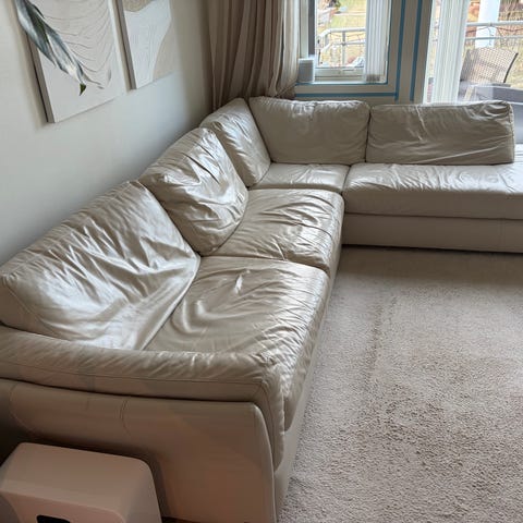 Vinkelsofa i skinn med sjeselong. Sjeselongdel 2,20. Den andre sofadelen er 2 meter.