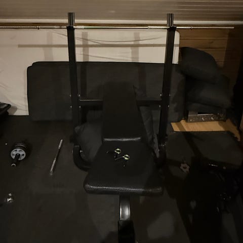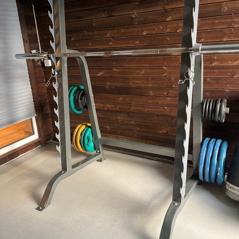 Enkel heimegym, benk med mulig for decline og incline kombiner med leg extension og leg curl. Følge med stang. Heimelaga squatrack med safetybars. Vektskivene som følge med er 8 x 1.25 kg, 2 x 1,5 kg, 2 x 5 kg og 2 x 10 kg. Stanga er nok rundt 10 kg.