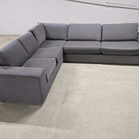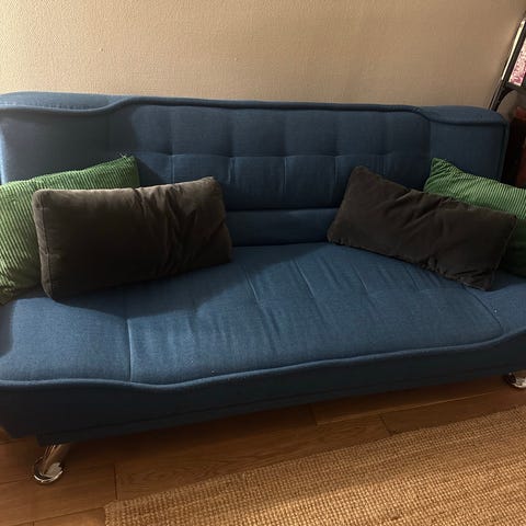 Beliani - Motala. Nett liten hjørnesofa. Avtakbare trekk. Kan deles i to. Enkel å montere. Noen av putene er litt slitt, men elles ok. Passer fint i mindre rom. Kan kanskje være behjelpelig med levering.