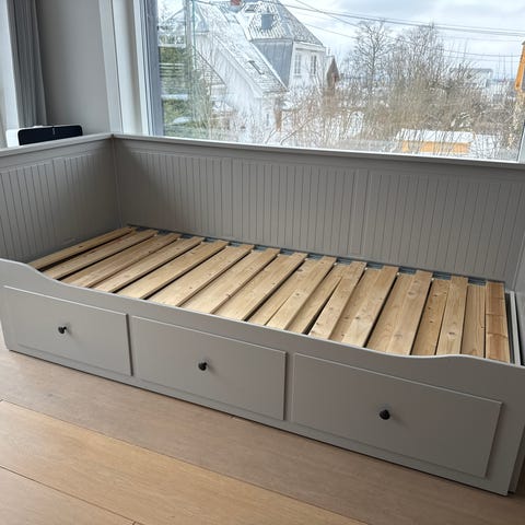 Meget praktisk IKEA Hemnes seng med tre oppbevaringsskuffer.