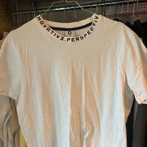 H&M T-skjorte i hvit farge, herrestørrelse L. T-skjorten har et trykk av et kamera på baksiden og et lite rødt logo-trykk av KODAK på forsiden.