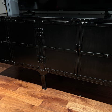 IKEA TV-benk i hvit farge. Møbelet har flere rom for oppbevaring og plass til elektronikk som TV og spillkontroller. Passer til stue eller mediarom.