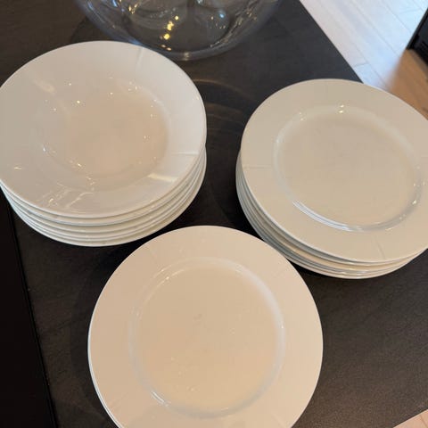 Kan også selge servise og glass separat. Bud mottas der. Selges for 850kr eller bud. Ene frokosttallerken har hakk på kanten.