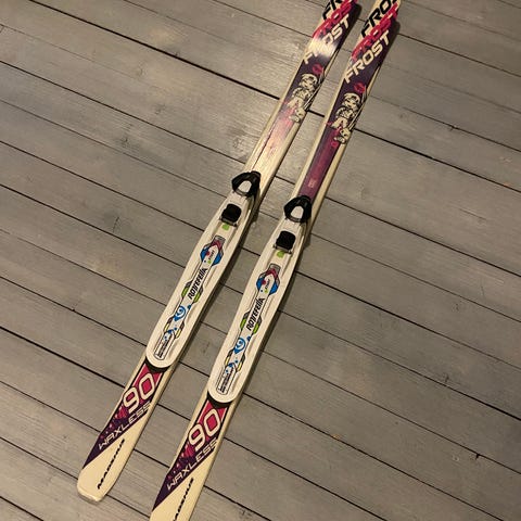 Rosa smørefrie ski fra Fischer, med staver og sko. Skiene er 110 cm, stavene 80 cm og skoene er str 27.