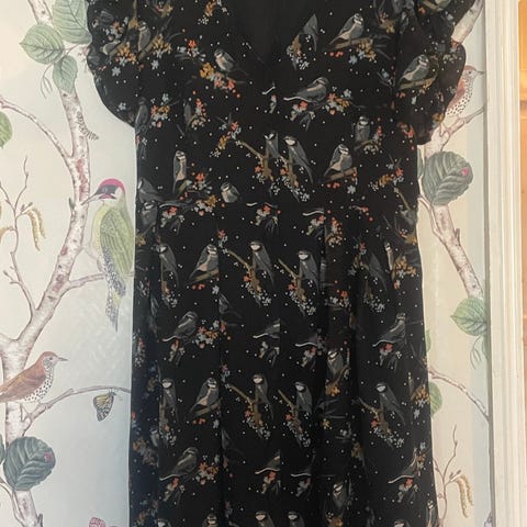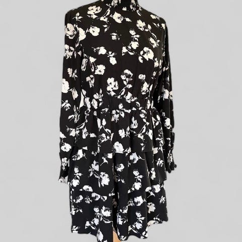 Marks & Spencer hverdagskjole i svart med blomsterprint. Laget av viskose, størrelse 44. Kjolen har knappestolpe foran og belte i livet.