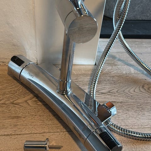 Servant/kjøkkenbatteri i krom med to fleksible slanger for tilkobling.