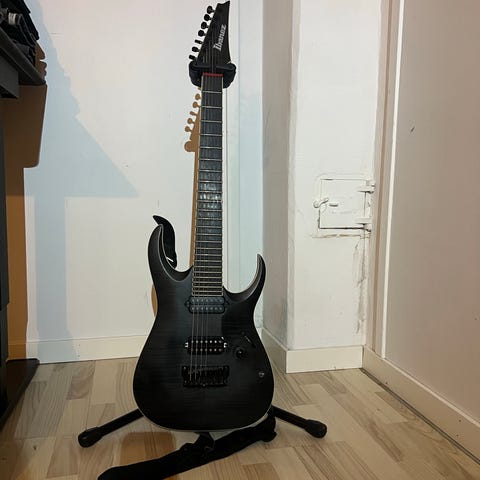 Ibanez elektrisk gitar med svart finish. 7 strenger. Tynn hals i kjent Ibanez-stil, god å spille på. Spesielt egnet til hardrock/metall. Gator flight case medfølger.