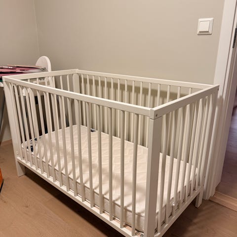 Sprinkelseng som har stått hos besteforeldre, nesten ikke brukt. Seng og madrass fra Barnas hus. Link til seng: https://www.barnashus.no/yngri/sprinkelseng-nordlys-white. Link til madrass: https://www.barnashus.no/yngri/yngri-dromme-140x70x10-10e01688