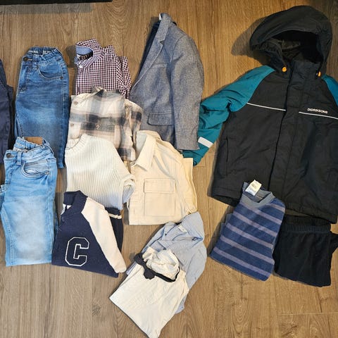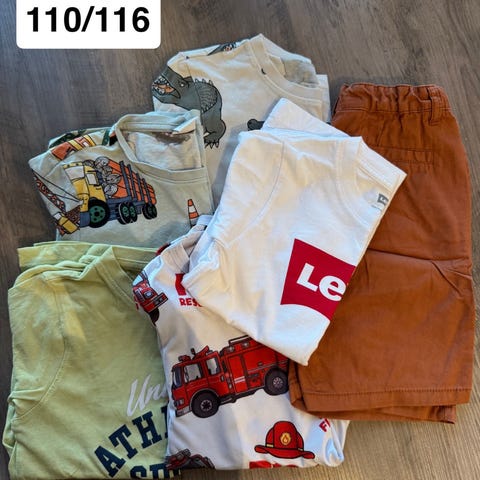 Reflex of Name it barneklær for gutt i størrelse 116 med flerfarget design. Settet inkluderer ulike plagg som bukser og gensere med forskjellige farger og mønstre.