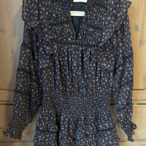 Nelly hverdagskjole i størrelse 36 for kvinner. Kjolen er lilla med et mønster av små blomster. Den har knapper foran og lange ermer, egnet for hverdagsbruk.